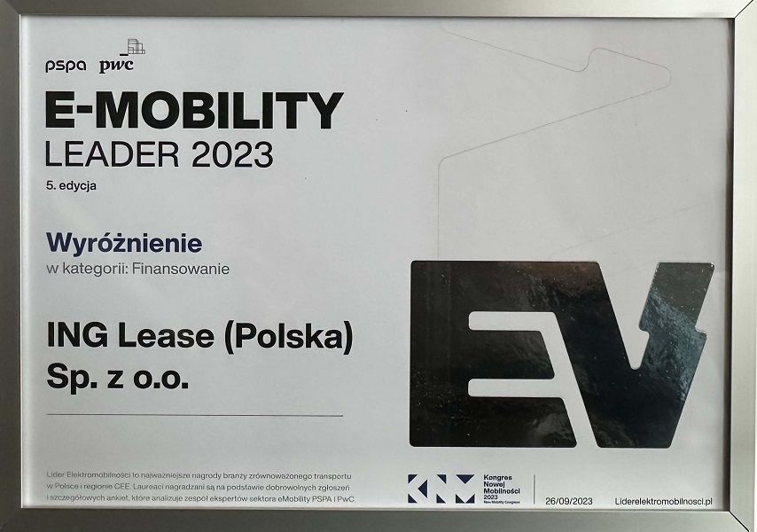 Spółka razem z platformą ING Lease Now została nagrodzona w kategorii „Leasing" w ramach plebiscytu „Najlepsze Produkty dla Biznesu 2023” organizowanego przez Gazetę Finansową.